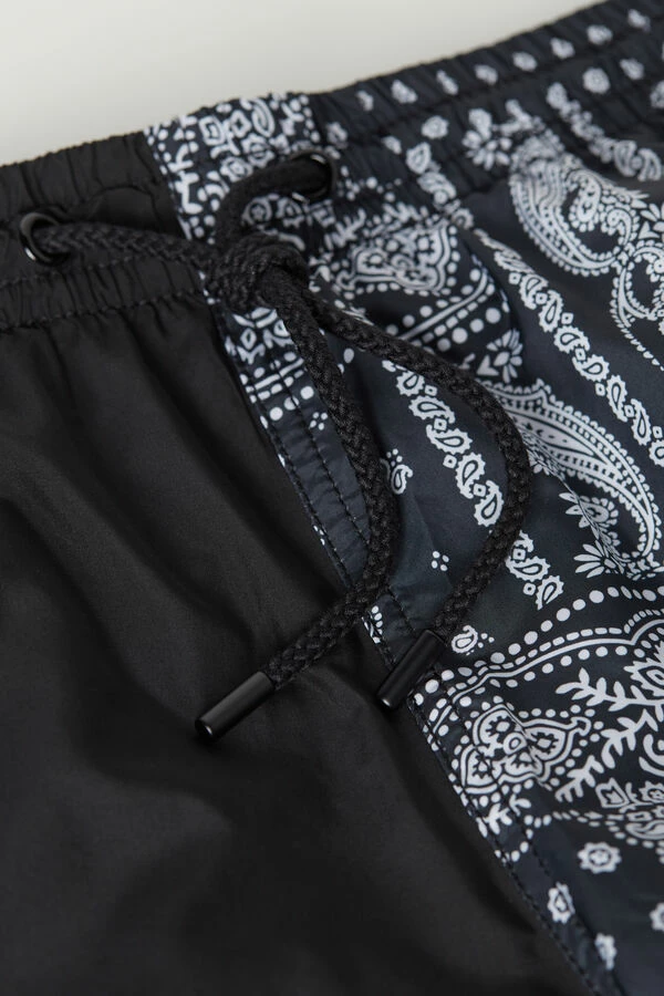 Bandana print swim trunks in soft and light quick-dry waterproof fabric. It features a comfortable internal briefs style lining in soft jersey in the same color as the trunks. Features practical side pockets and a back pocket. The waistband gathers with a drawstring with a practical grommet on the side to use for keys. Regular fit with mid-thigh length.