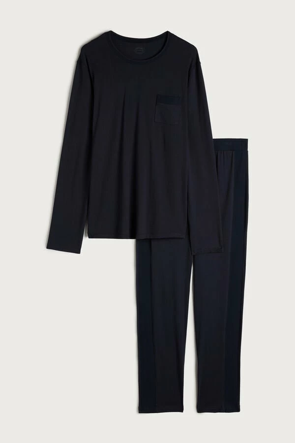 Men’s long pajamas in 100% Supima® cotton with piqué details. Long-sleeve crew-neck top with pocket. Long bottoms with side pockets and rear pocket. The model is 6’1″ tall and wears size L. Sold in Intimissimi Man stores.