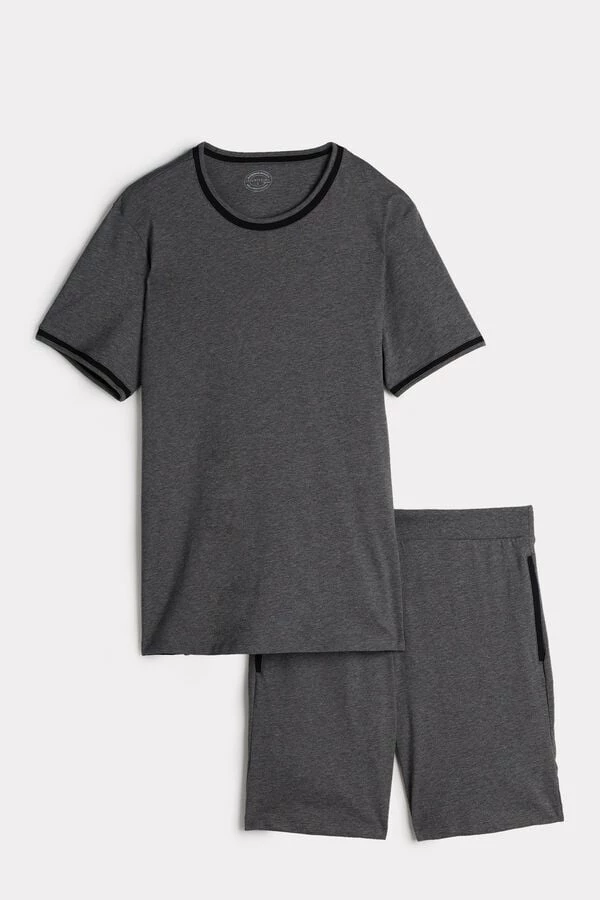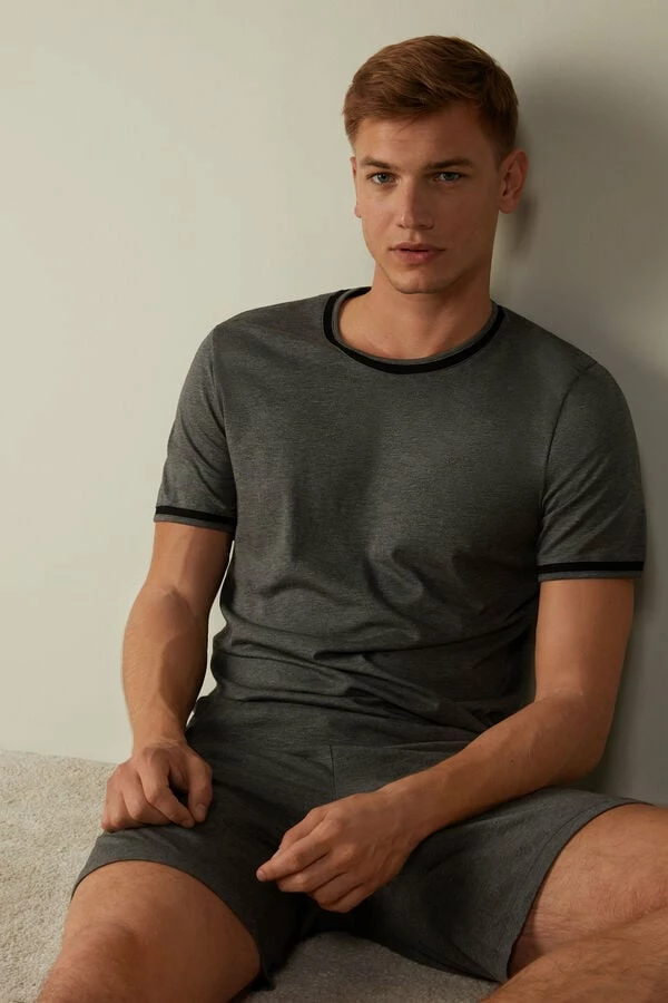 Men’s cropped pajamas in 100% Supima® cotton with piqué details. Short-sleeve crew-neck top and cropped bottoms in a plain design. The model is 6’1″ and wears size L. Sold in Intimissimi Man stores.