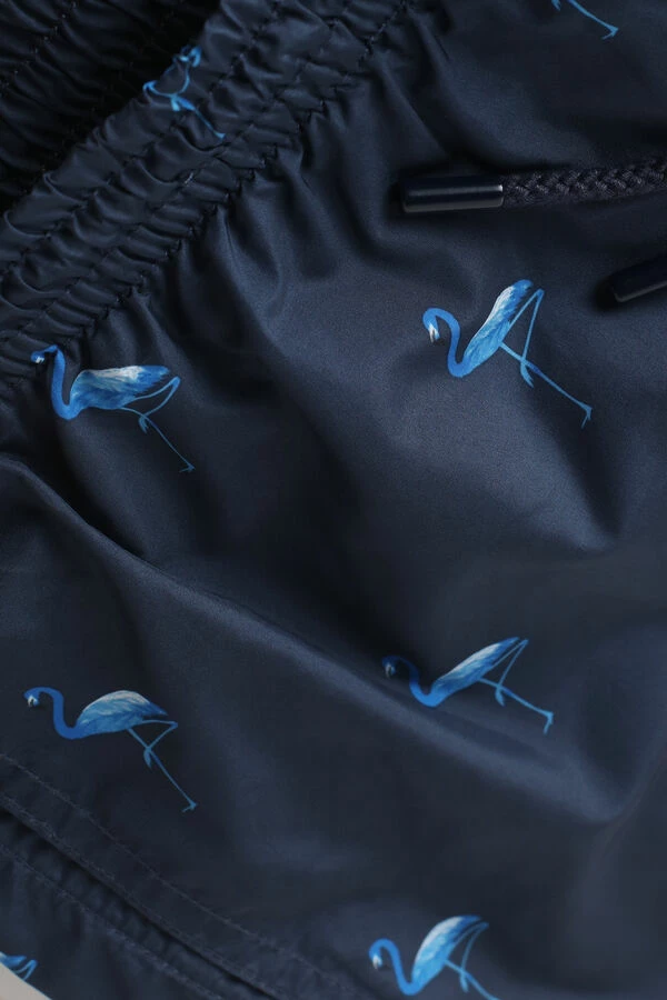 Flamingo print swim trunks in soft and light quick-dry waterproof fabric. It features a comfortable internal briefs style lining in soft jersey in the same color as the trunks. Features practical side pockets and a back pocket. The waistband gathers with a drawstring with a practical grommet on the side to use for keys. Regular fit with mid-thigh length.