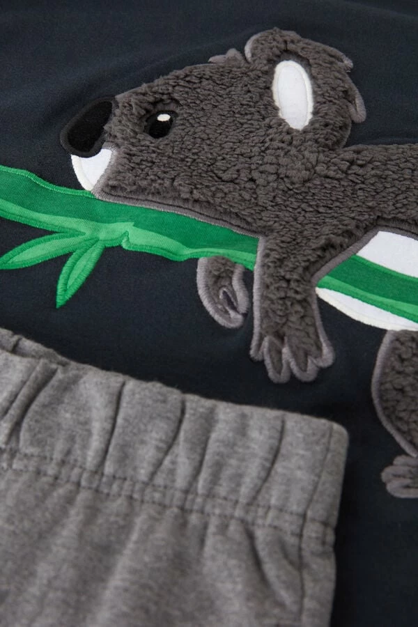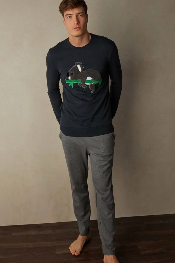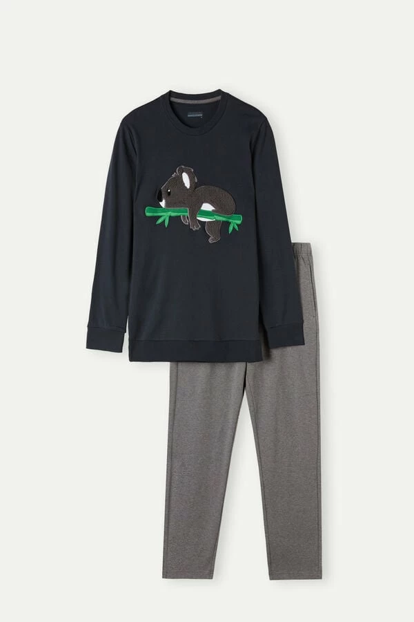 Cotton interlock pajamas with long sleeve crew neck blue shirt with central Koala embroidery that features a teddy bear effect. Full length grey pants with side pockets. Regular fit.