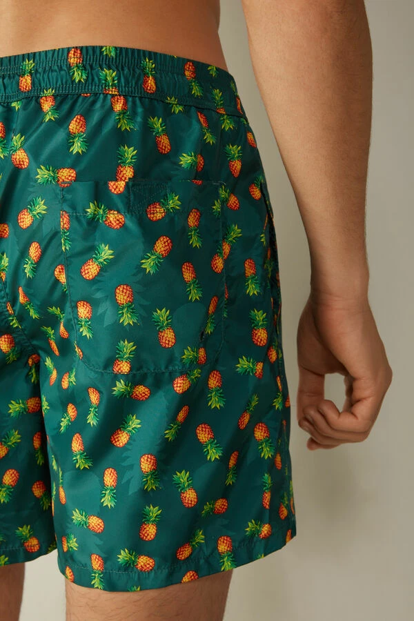 Medium length swim trunks in soft waterproof fabric featuring a pineapple print. Features an internal briefs-like lining in soft jersey characterized by side pockets and a back pocket. The waistband gathers with a drawstring. The fabric in this garment contains recycled fibers.