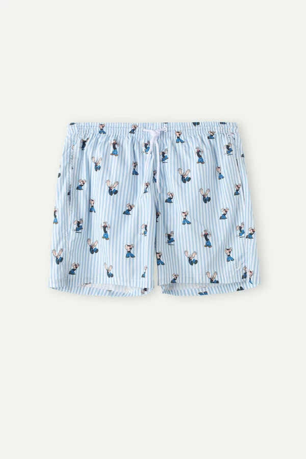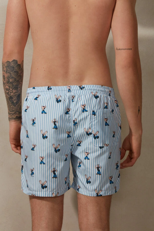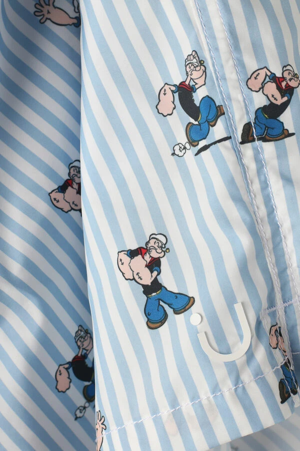 Striped Popeye print swim trunks in soft and light quick-dry waterproof fabric. It features a comfortable internal briefs style lining in soft jersey in the same color as the trunks. Features practical side pockets and a back pocket. The waistband gathers with a drawstring with a practical grommet on the side to use for keys. Regular fit with mid-thigh length.