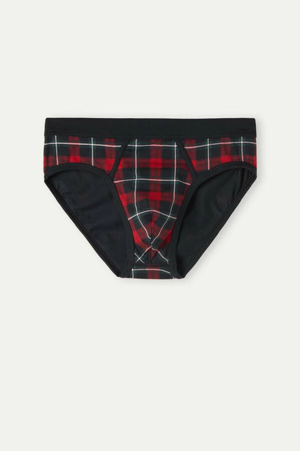 Briefs with red Tartan print in soft stretch Supima® cotton. Covered soft elastic in contrast color. Softly hug the body.