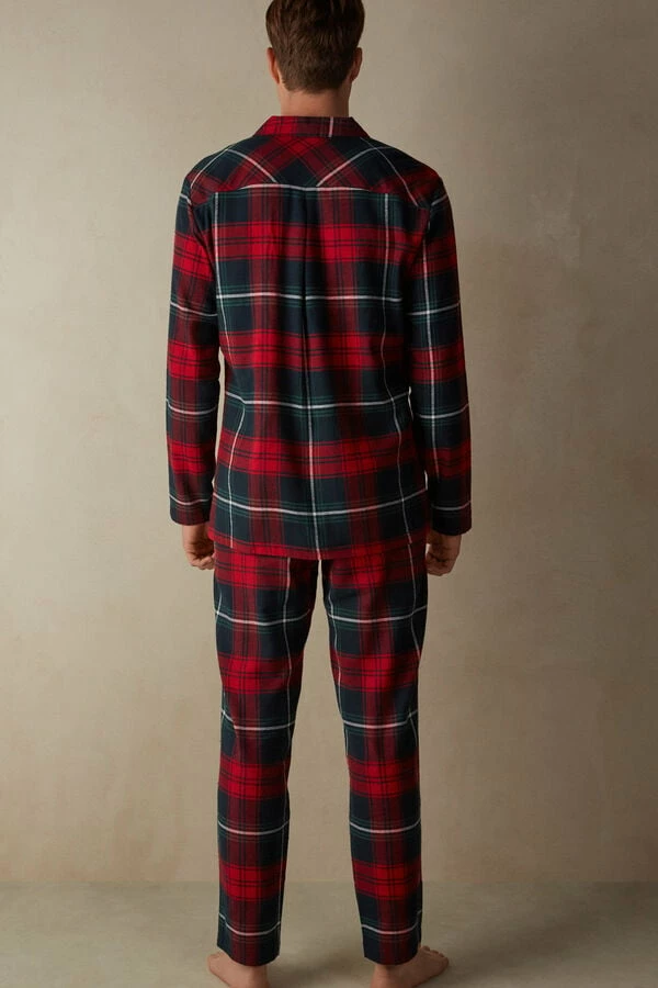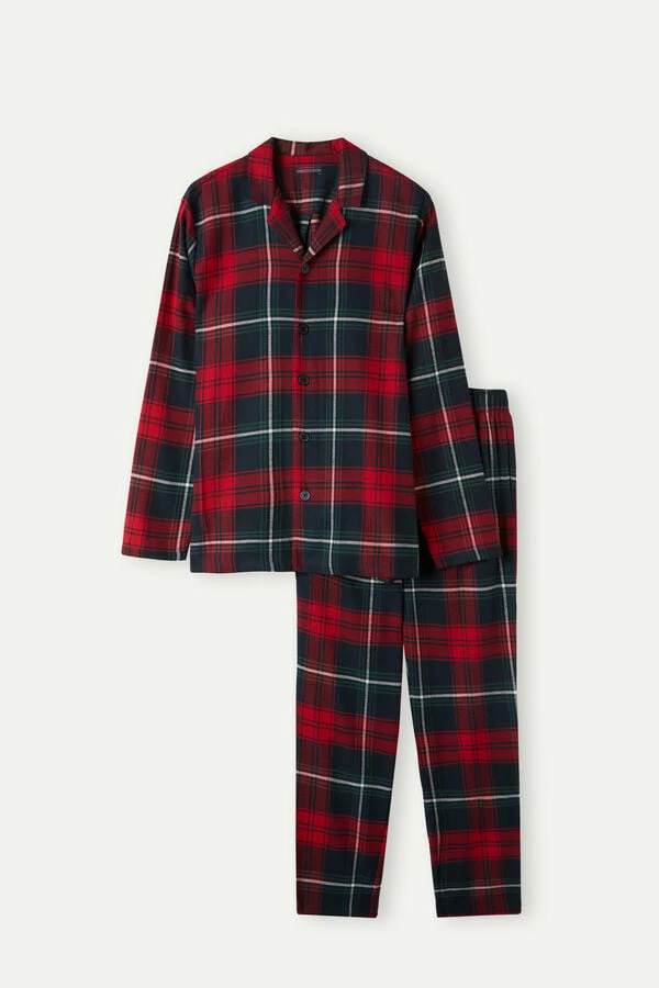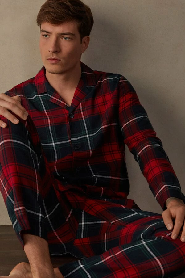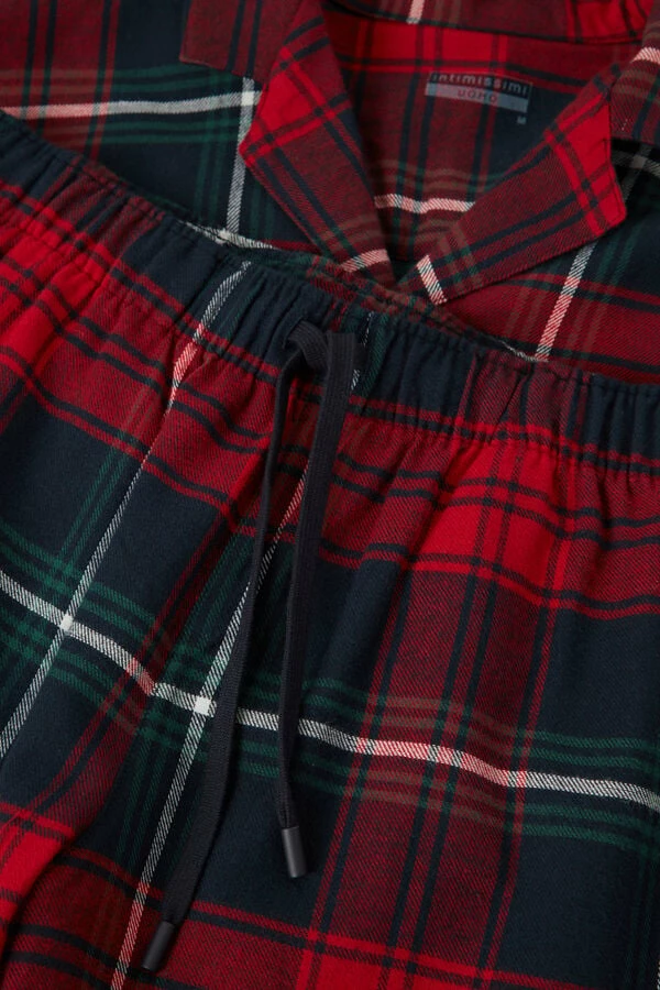 Full length pajamas in brushed cotton cloth with red Tartan pattern. Shirt with front buttons and lapel collar, back squared yoke with pleats. Pants with drawstring waist and side pockets. Regular fit.