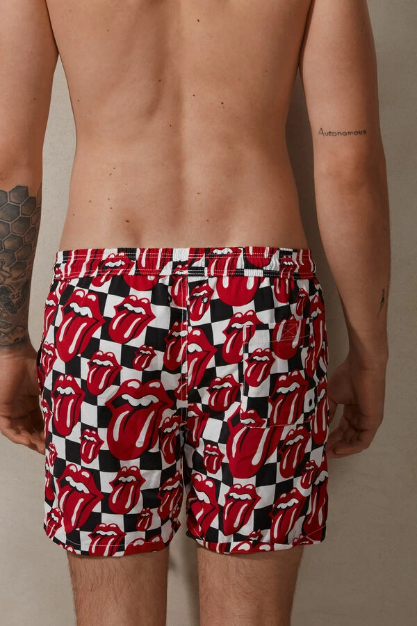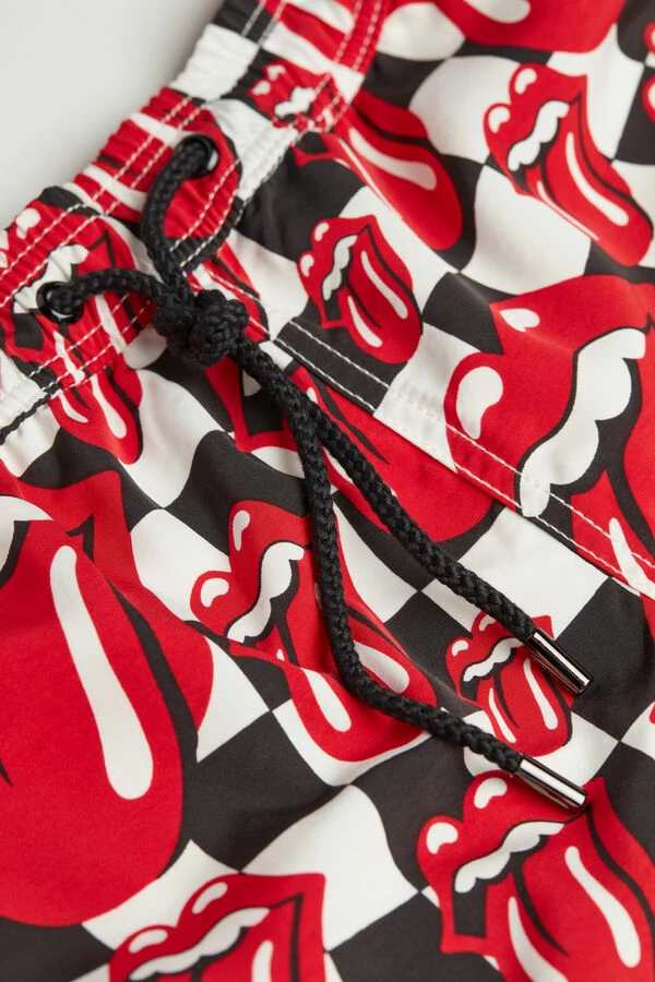 Medium length swim trunks in soft waterproof fabric featuring a white/black check print and the Rolling Stones logo. Features an internal briefs-like lining in soft jersey featuring side pockets and a back pocket. The waistband gathers with a drawstring.