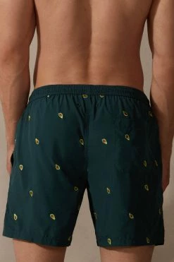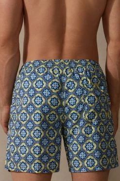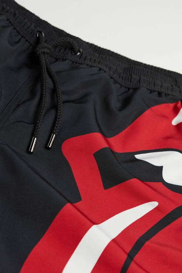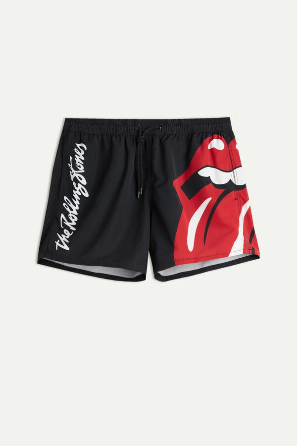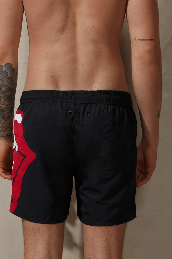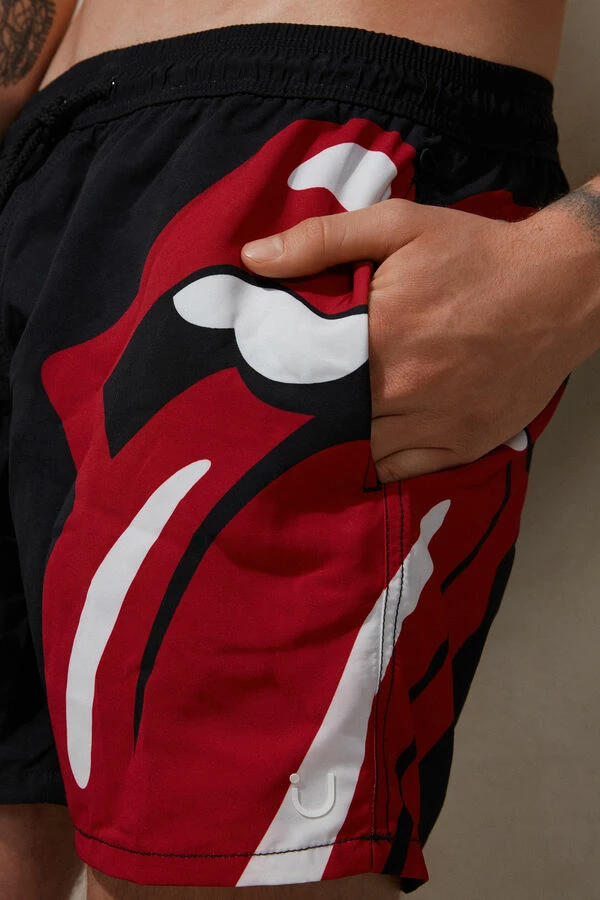 Medium length swim trunks in soft waterproof fabric featuring a Rolling Stones print. Features an internal briefs-like lining in soft jersey featuring side pockets and a back pocket. The waistband gathers with a drawstring.