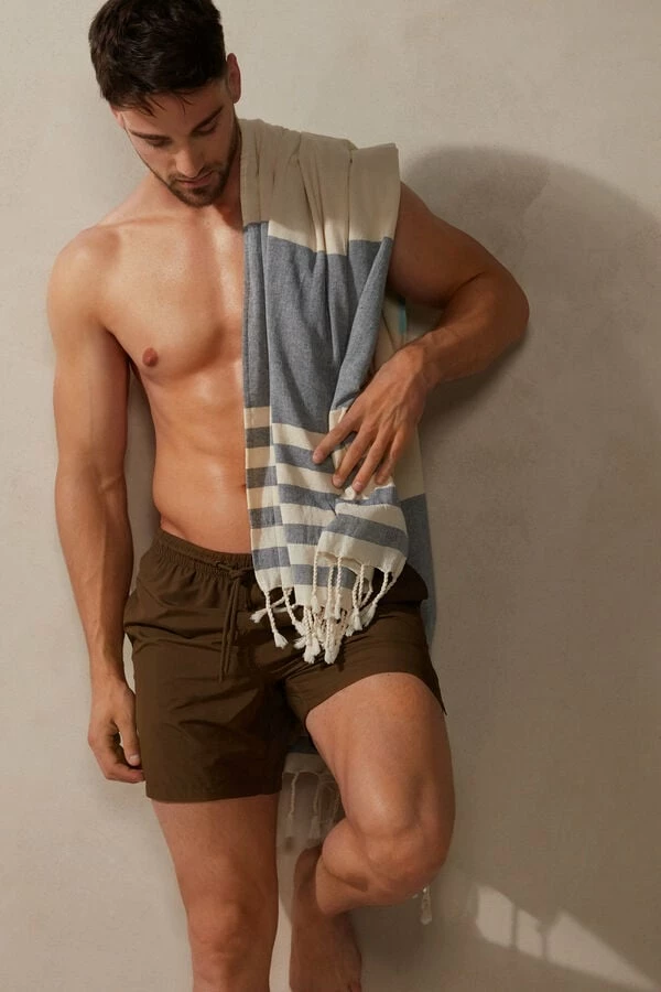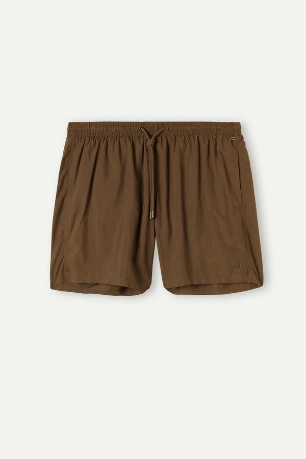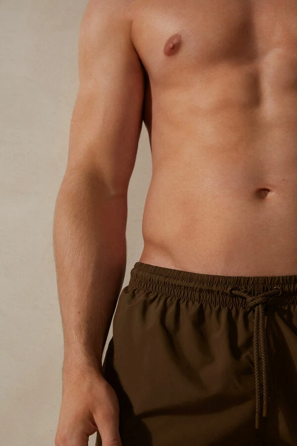 Single color swim trunks in soft and light quick-dry waterproof fabric. It features a comfortable internal briefs style lining in soft jersey in the same color as the trunks. Features practical side pockets and a back pocket. The waistband gathers with a drawstring with a practical grommet on the side to use for keys. Regular fit with mid-thigh length.