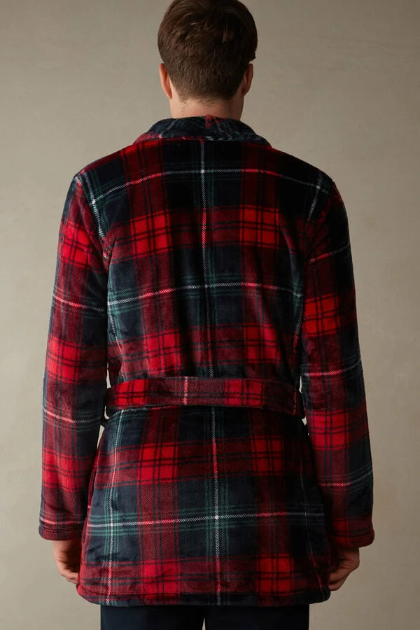 Short robe in soft and warm Tartan fleece with side pockets and belt.