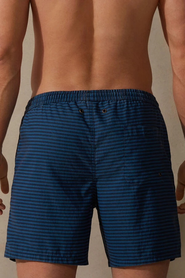 Washed effect stripe pattern swim trunks in soft and light quick-dry waterproof fabric with light ruched effect. The soft yet substantial fabric makes these trunks perfect to wear as shorts with a t-shirt or a fresh linen shirt. It features a comfortable internal briefs style lining in soft jersey in the same color as the trunks. Features practical side pockets and a back pocket. The waistband gathers with a drawstring with a practical grommet on the side to use for keys. Regular fit with mid-thigh length.